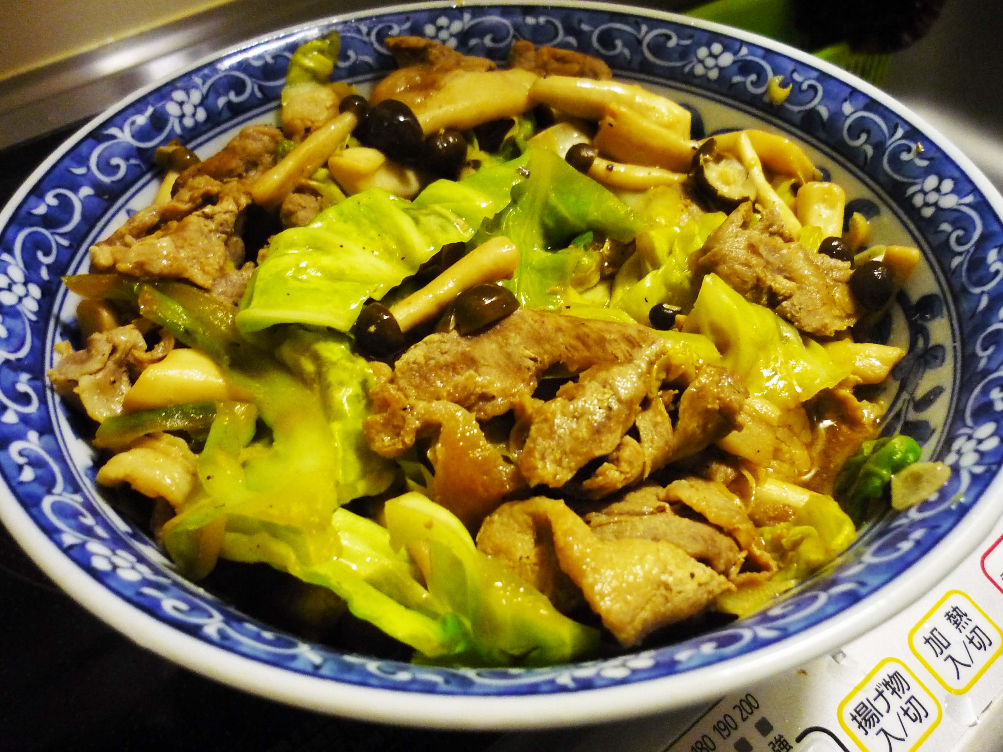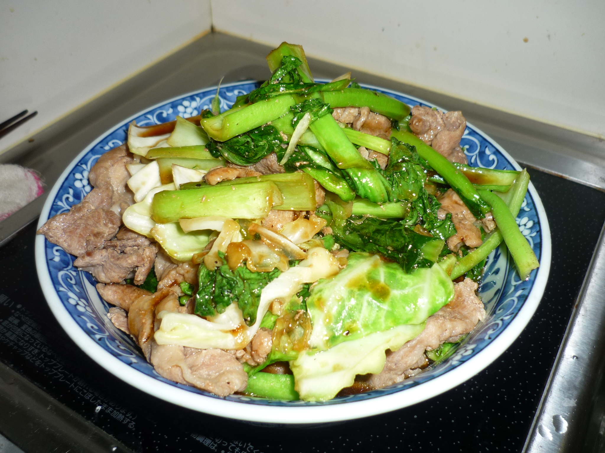食材:豚肉350g(300円)、小松菜(75円)、キャベツ1/4(50円) 合計:425円