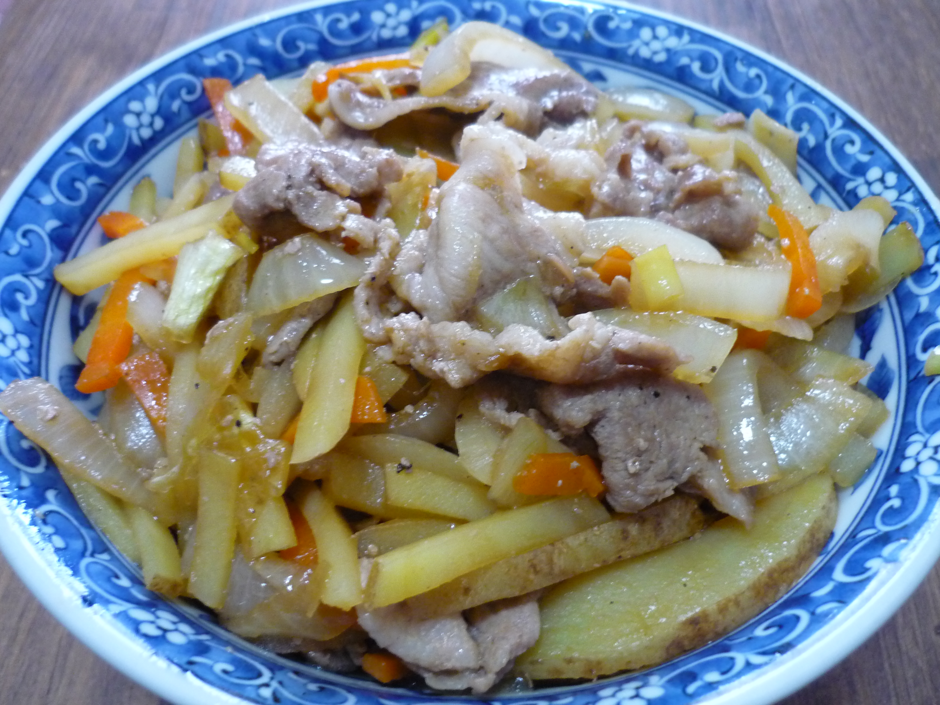 食材:じゃがいも3個(97円)、玉ねぎ2.5個(62.5円)、にんじん0.3本(48円)豚肉200g程(300円) 合計:507円