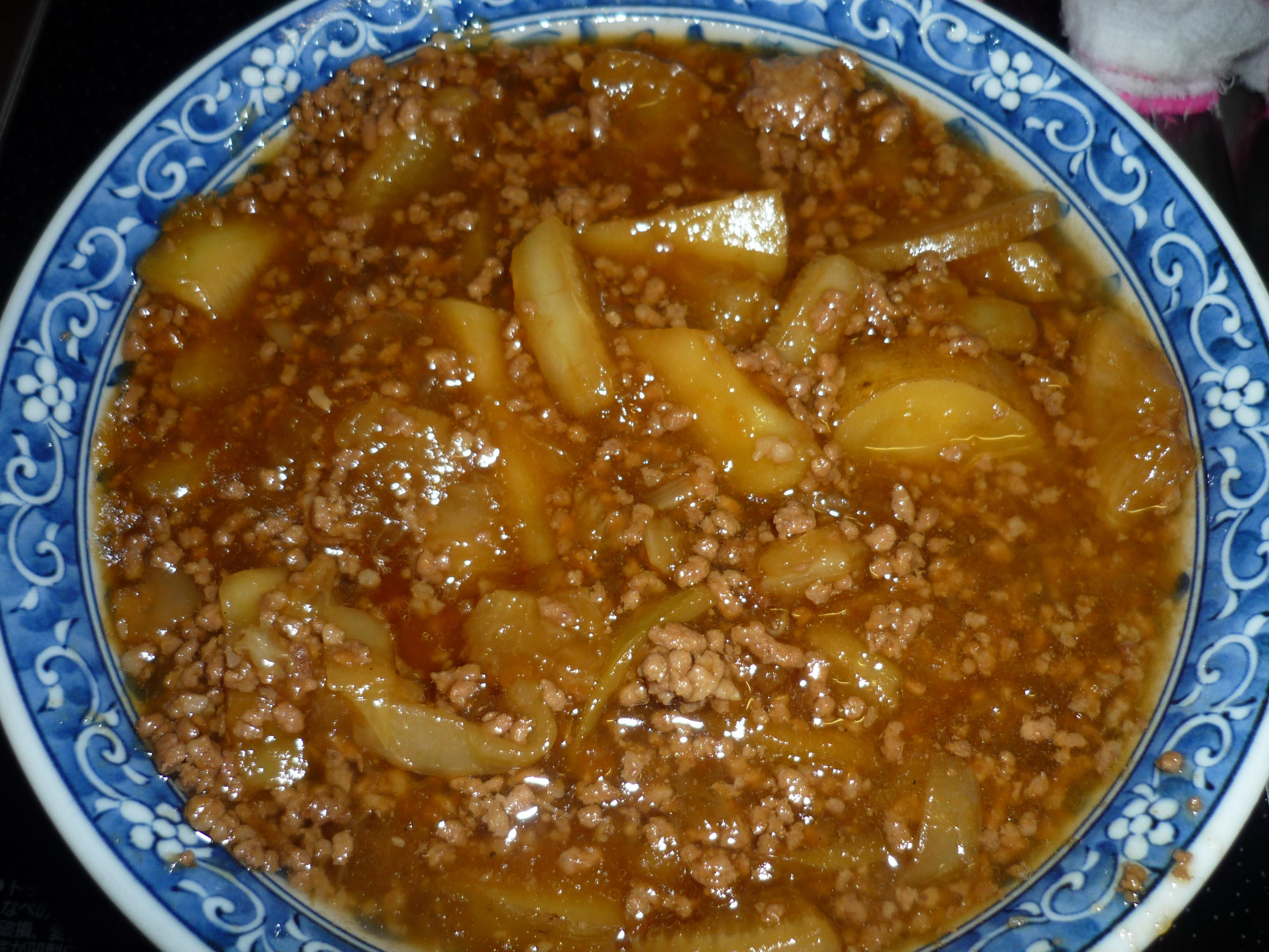食材:大根半分(50円)、じゃがいも1個(30円)、ひき肉250g程(300円) 合計:380円