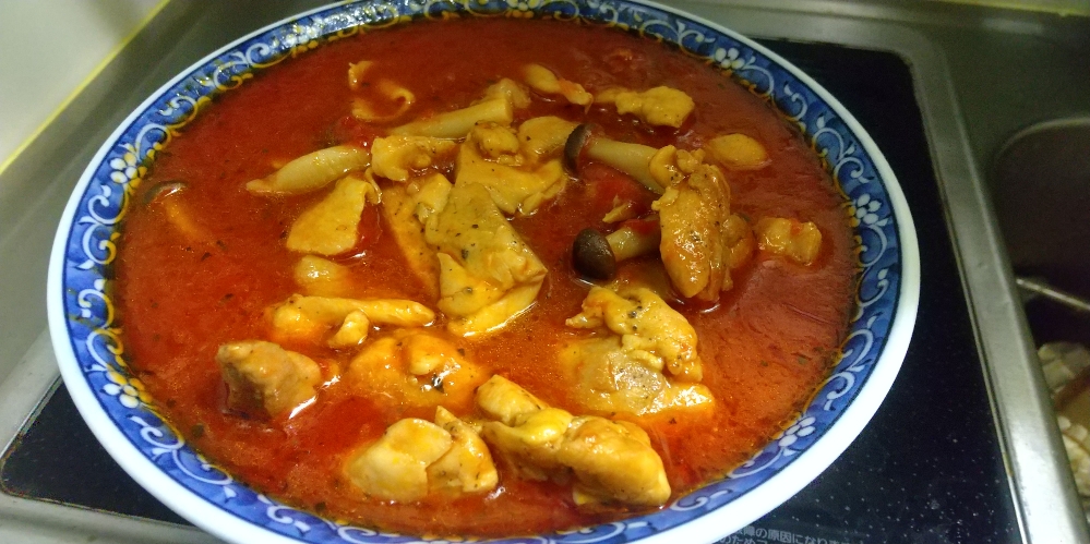 食材:もも肉2枚(250円)、しめじ1パック(50円) 、トマト缶(100円) 合計:400円