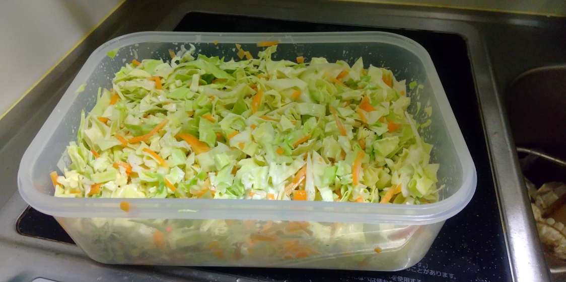 食材:キャベツ1/4(38円)、人参半分(10円) 合計:48円